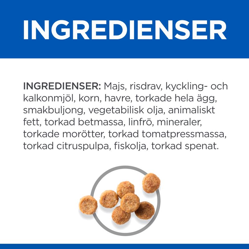 Din lilla hund har förmodligen en stor plats i ditt hjärta. Hill's Science Plan Mature Adult 7+ Senior Vitality Small & Mini Chicken är ett utmärkt val för att stödja din trogna följeslagare med en optimal kost, även i högre ålder.Det mycket lättsmälta torrfodret är speciellt utformat för små raser och dvärgraser. De små foderbitarna är enkla att plockas upp och tuggas av din lilla hund. Fodret innehåller också en harmonisk kombination av högkvalitativa ingredienser som kan stödja hundens vitalitet och välbefinnande. Fettsyrorna omega-3 och -6 kan också bidra till en vacker päls och frisk hud.